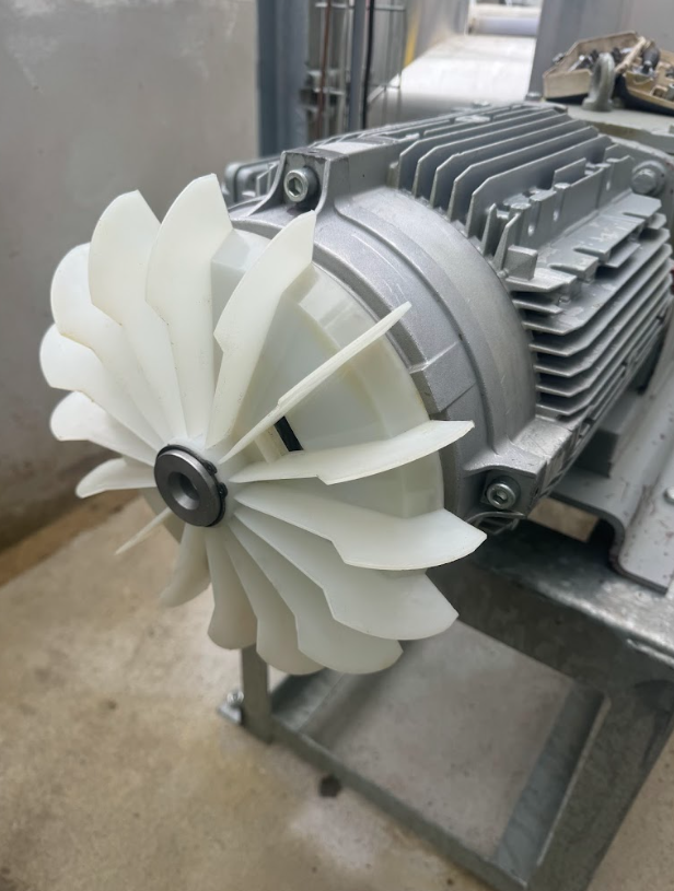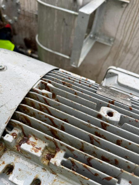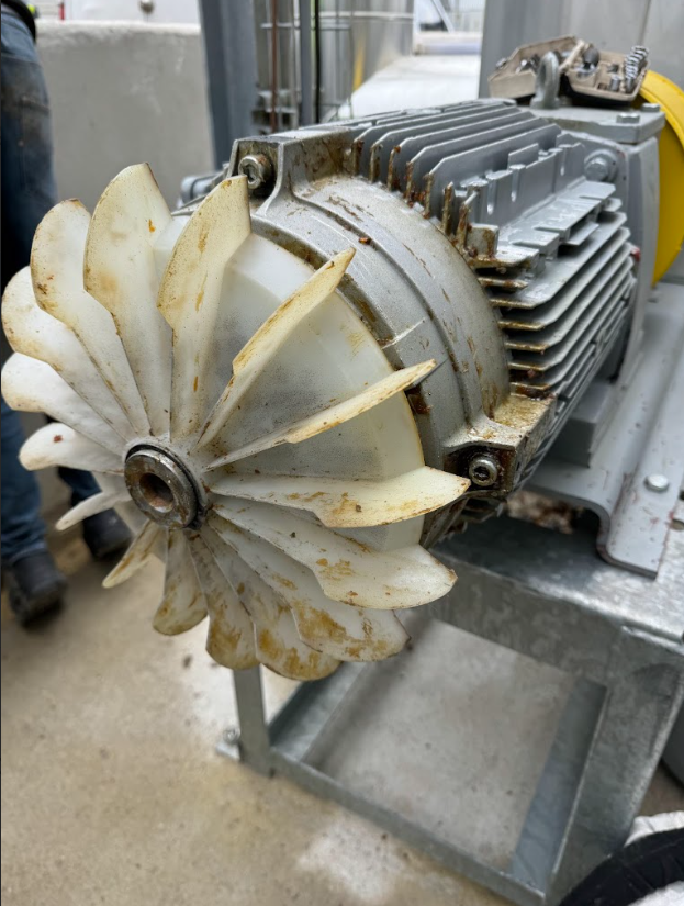 Les photos illustrent parfaitement l’efficacité de notre intervention. Le moteur électrique présentait un encrassement important dû à des projections d’hydrocarbures et à l’accumulation de poussières dans les ailettes de refroidissement. Avant notre passage, le ventilateur était recouvert de dépôts gras pouvant compromettre le refroidissement et accélérer l’usure mécanique.